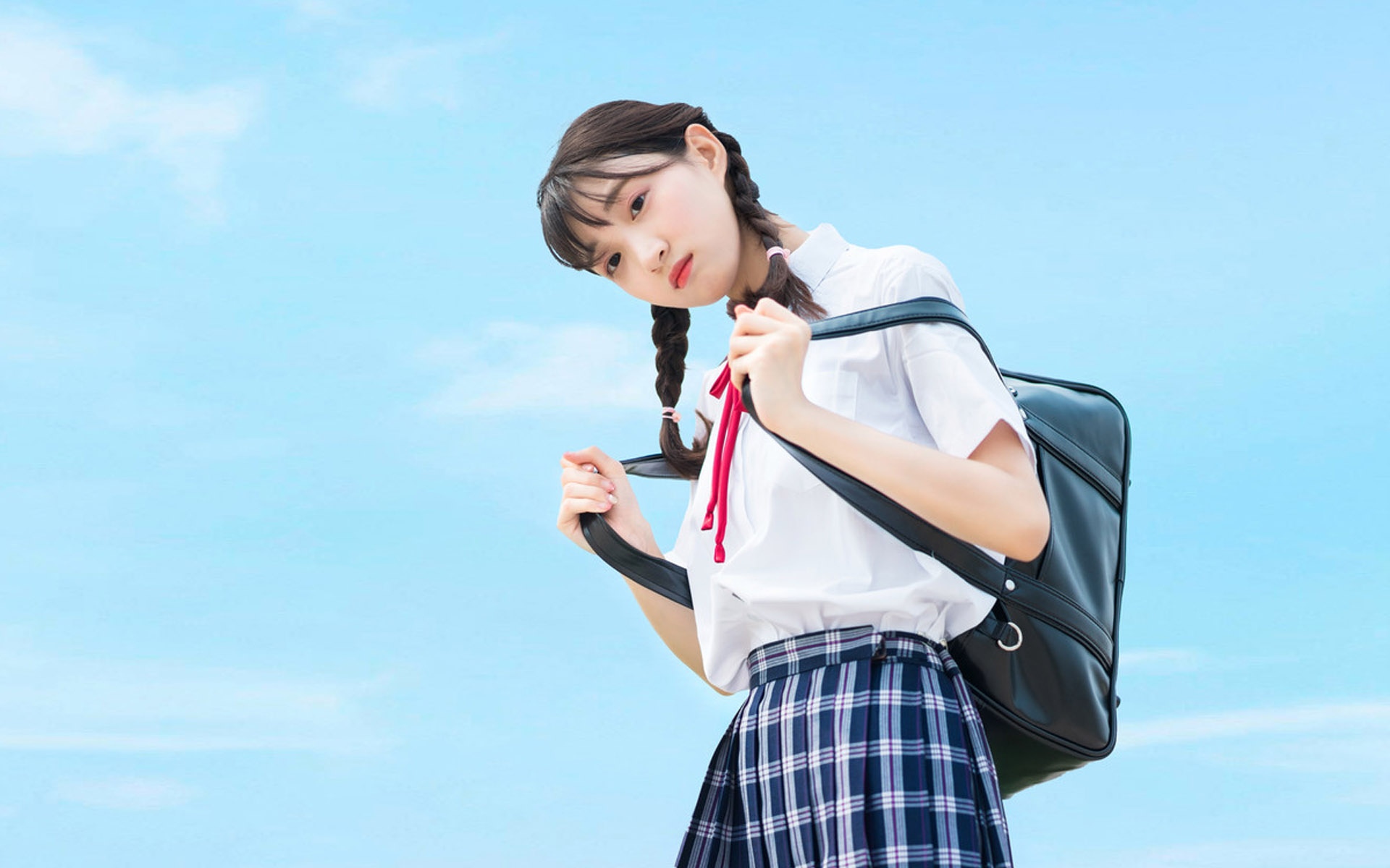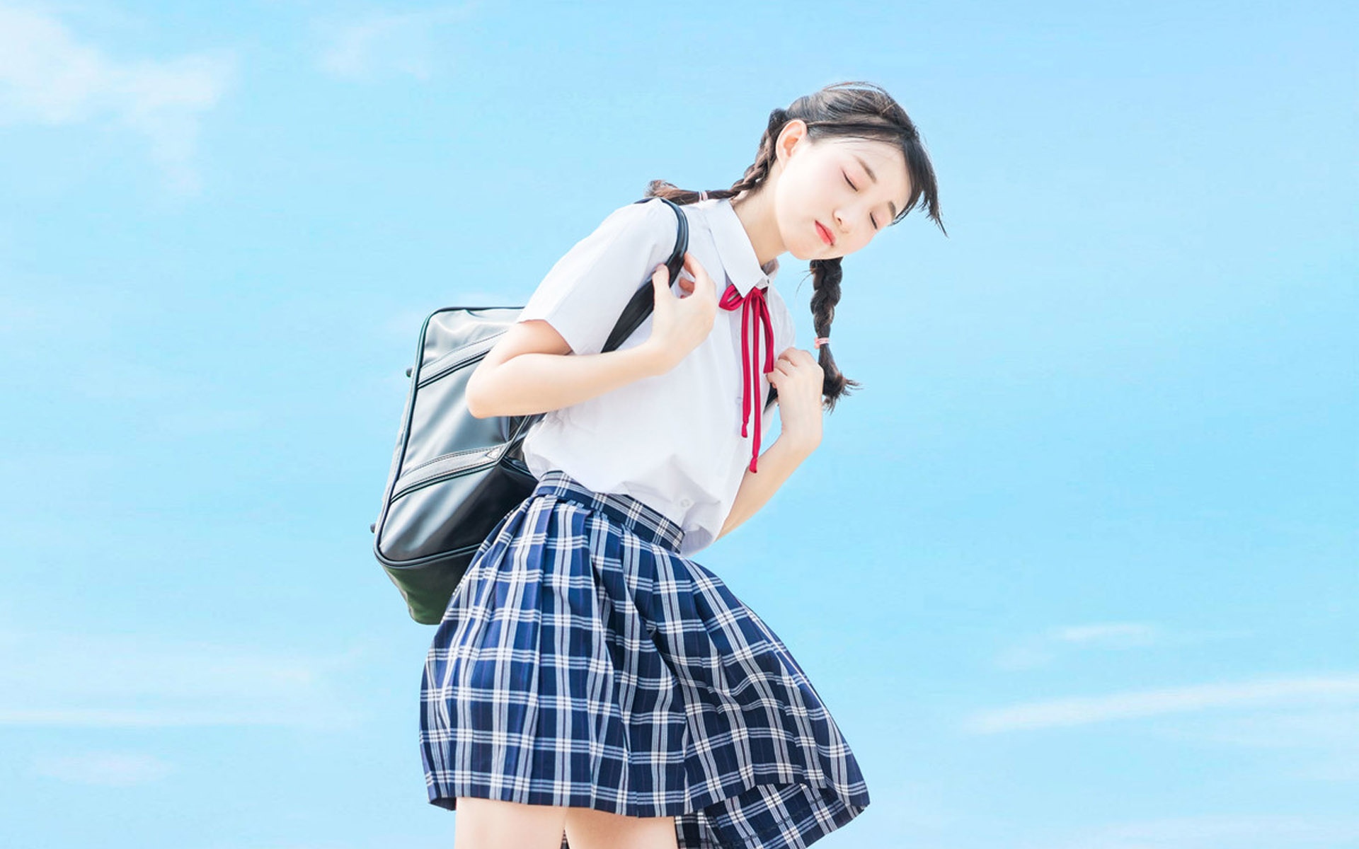 双马尾清纯女孩小清新校园写真壁纸,清澈明亮的瞳孔,弯弯的柳眉,长长的睫毛微微地颤动着,白皙无瑕的皮肤透出淡淡红粉,薄薄的双唇如玫瑰花瓣娇嫩欲滴。