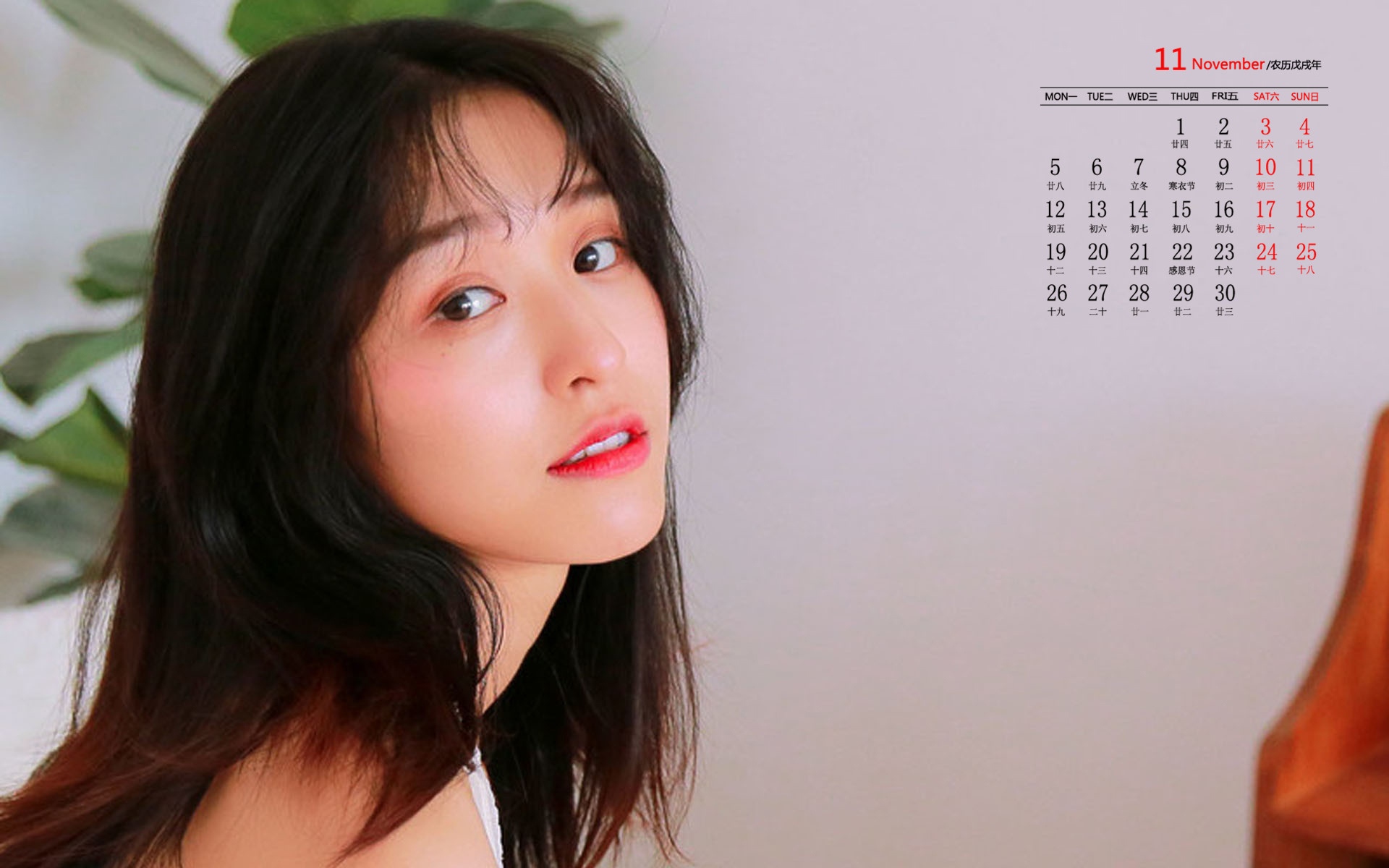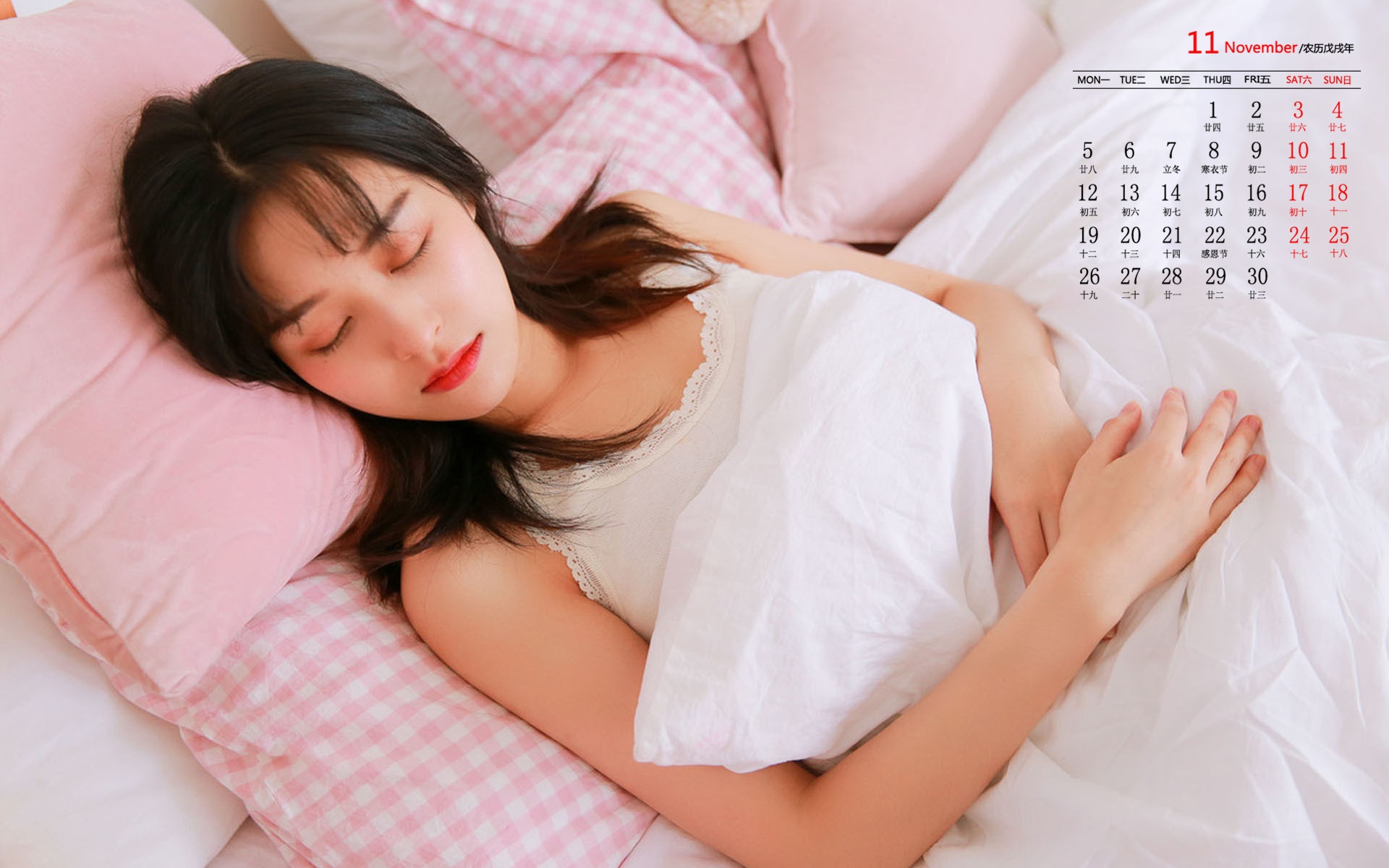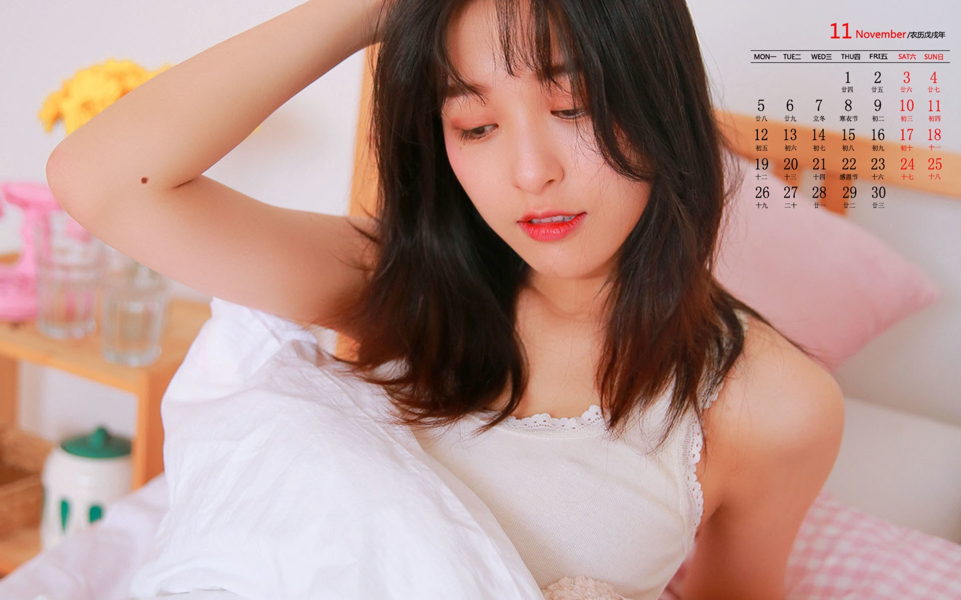2018年11月性感美女居家迷人日历壁纸,在闪闪发光的披肩柔发中,在淡淡入鬓的蛾眉问,在碧水漓漓的眼睛里,你竟是如此美丽可人。居家的你迷人极了!