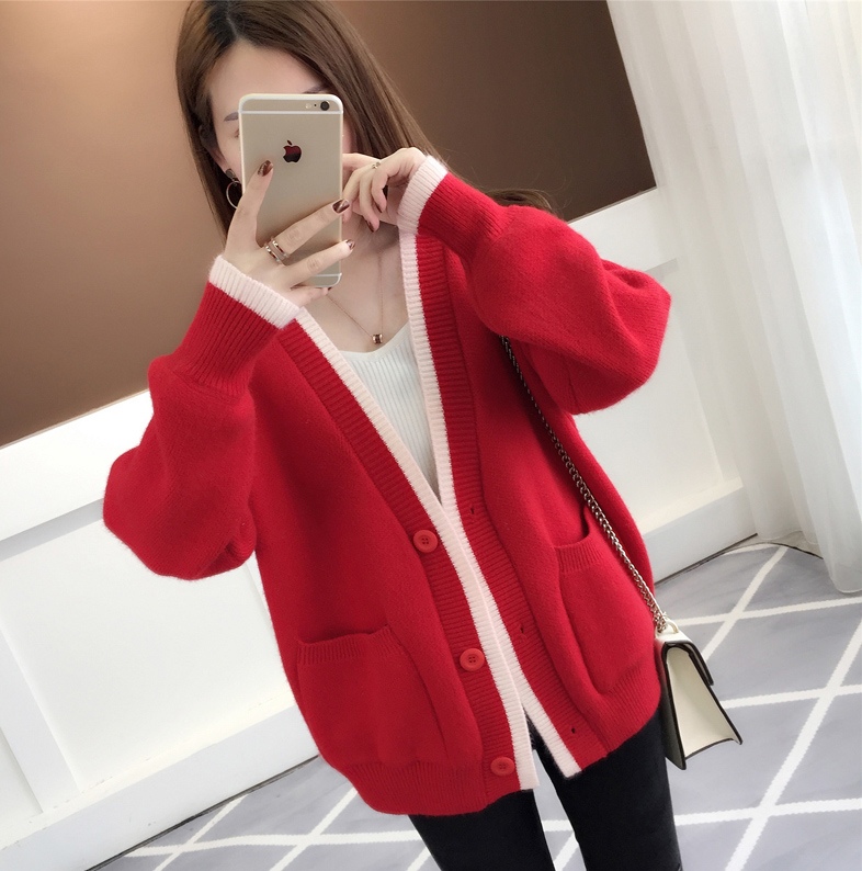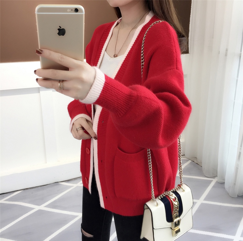 2018秋季新品时尚百搭复古红针织毛衣女装