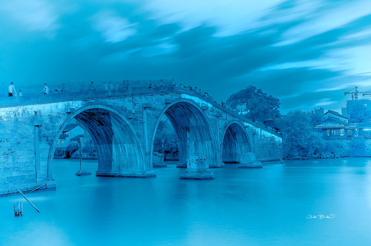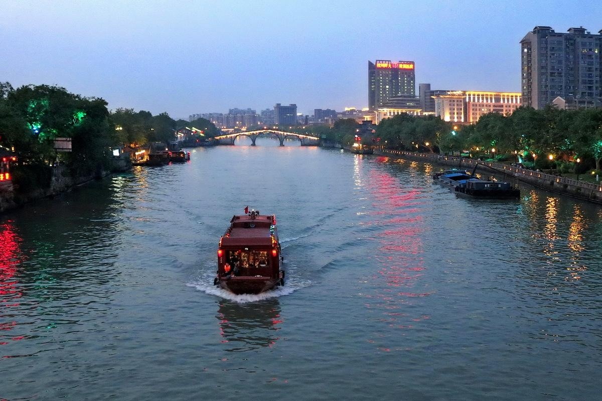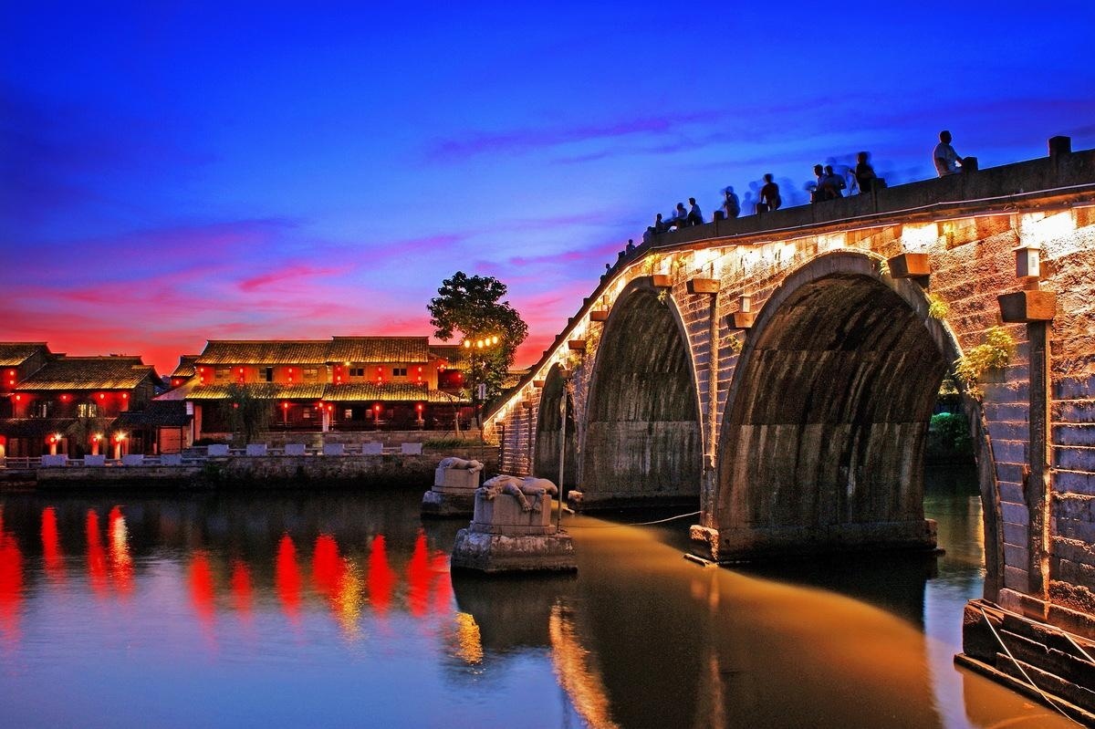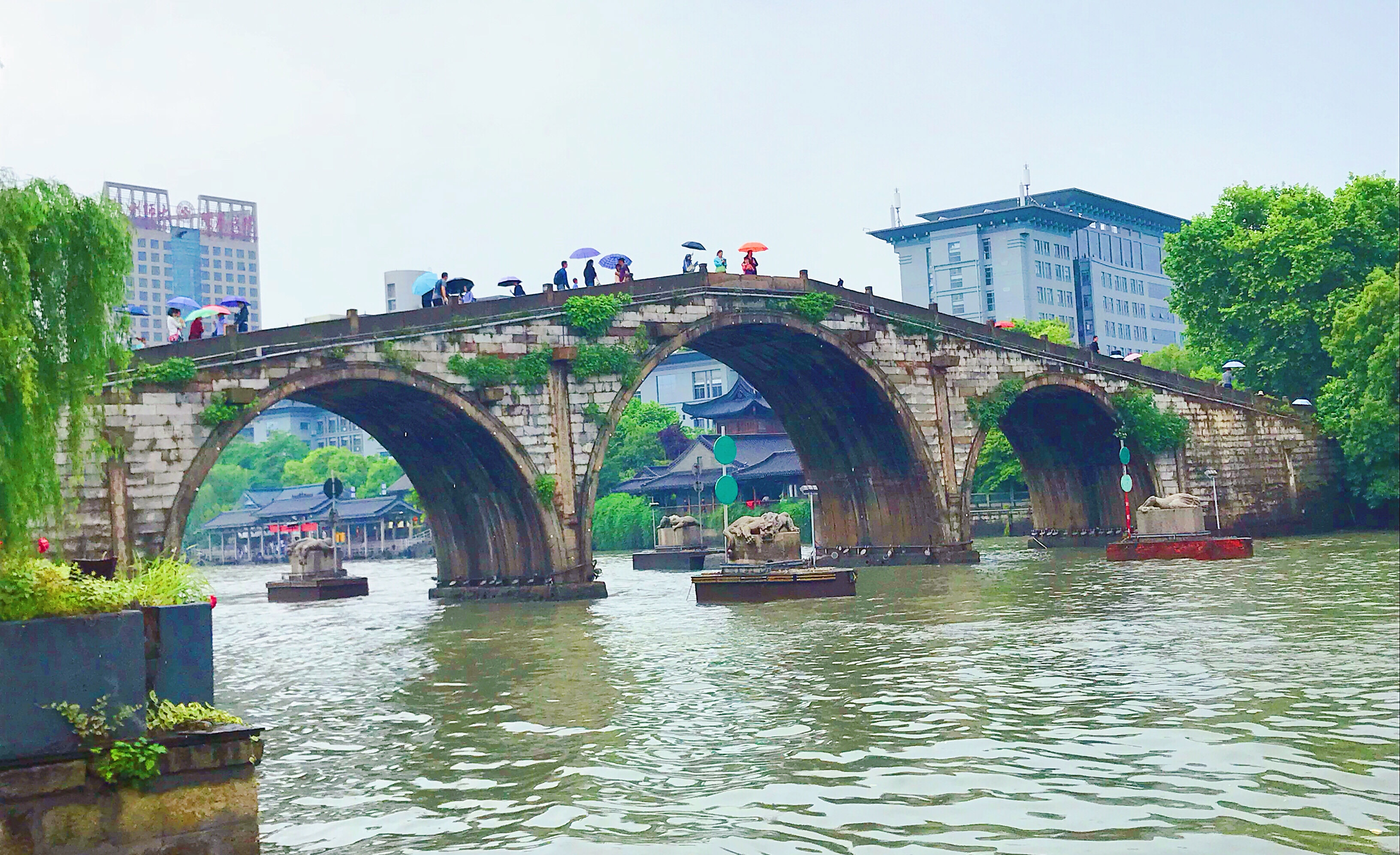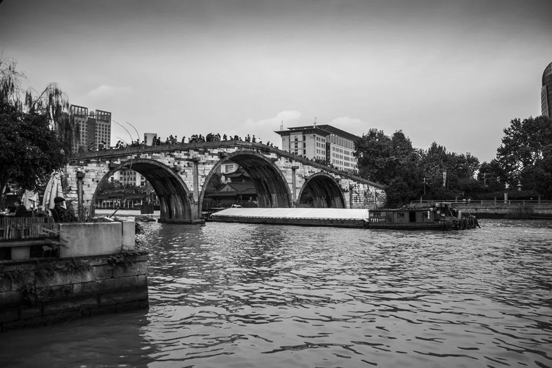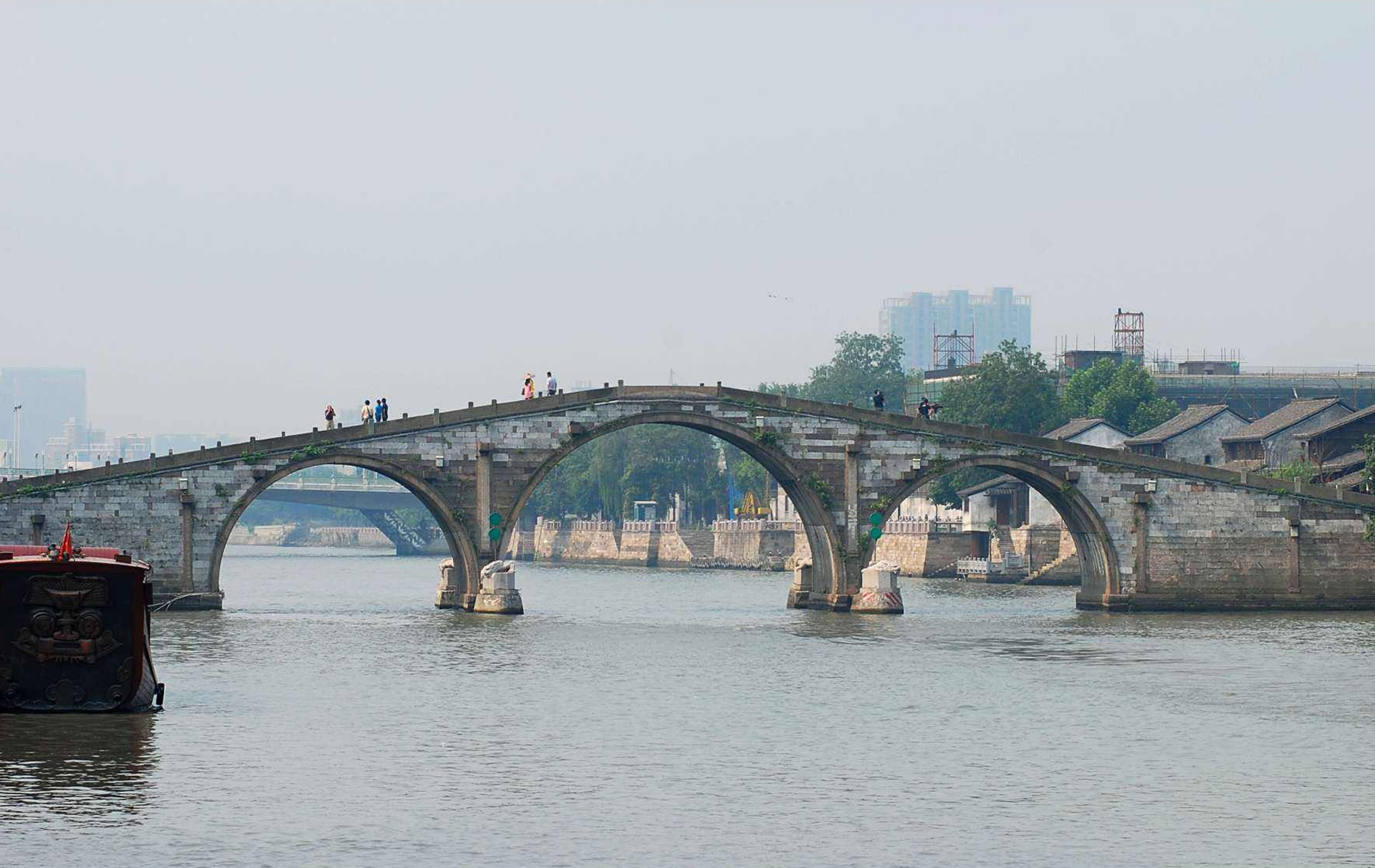 拱宸桥东西横跨大运河,是京杭大运河到杭州的终点标志。始建于明崇祯四年(1631年),清光绪十一年(1888年)重建,中间几经兴废。该桥全长92米,桥身用条石错缝砌筑,上贯穿长锁石,桥面呈柔和弧形,为三孔薄墩石拱桥,纵联分节并列砌筑。桥形巍峨高大,气魄雄伟,是杭州城区最大的一座石拱桥,同时也是拱宸桥地区的标志性建筑物。