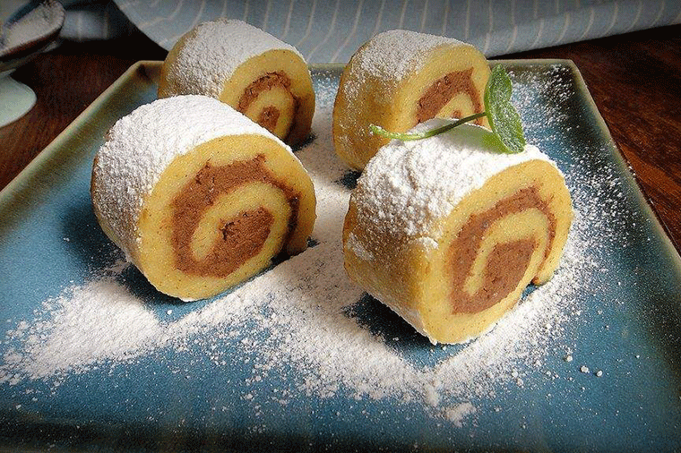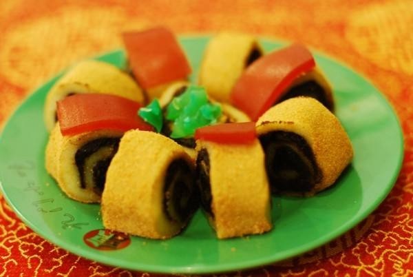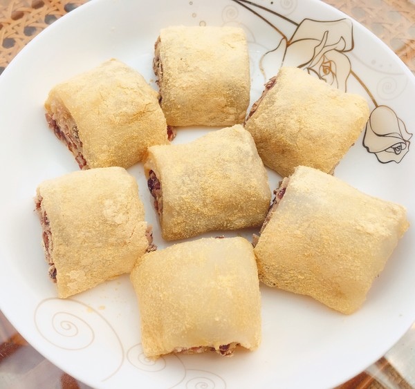 驴打滚是老北京传统小吃之一,成品黄、白、红三色分明煞是好看。因其最后制作工序中撒上的黄豆面,犹如老北京郊外野驴撒欢打滚时扬起的阵阵黄土,因此而得名“驴打滚”。豆面糕又称驴打滚,是北京小吃中的古老品种之一,它的原料是用黄米面加水蒸熟,和面时稍多加水和软些。另将黄豆炒熟后,轧成粉面。制作时将蒸熟的黄米面外沾上黄豆粉面擀成皮,然后抹上赤豆沙馅(也可用红糖)卷起来,切成100克左右的小块,撒上白糖就成了。制作时要求馅卷得均匀,层次分明,外表呈黄色,特点是香、甜、粘,有浓郁的黄豆粉香味儿。