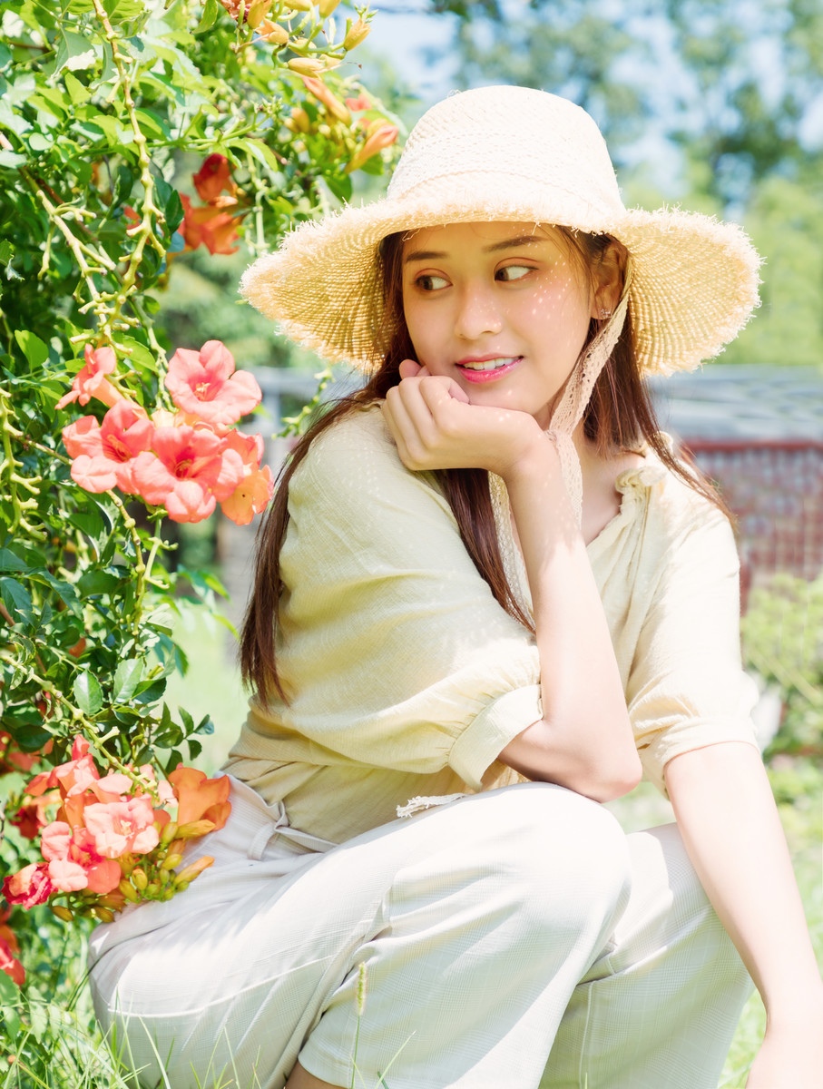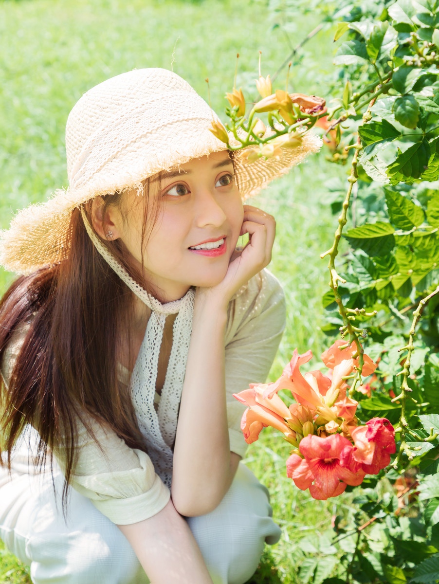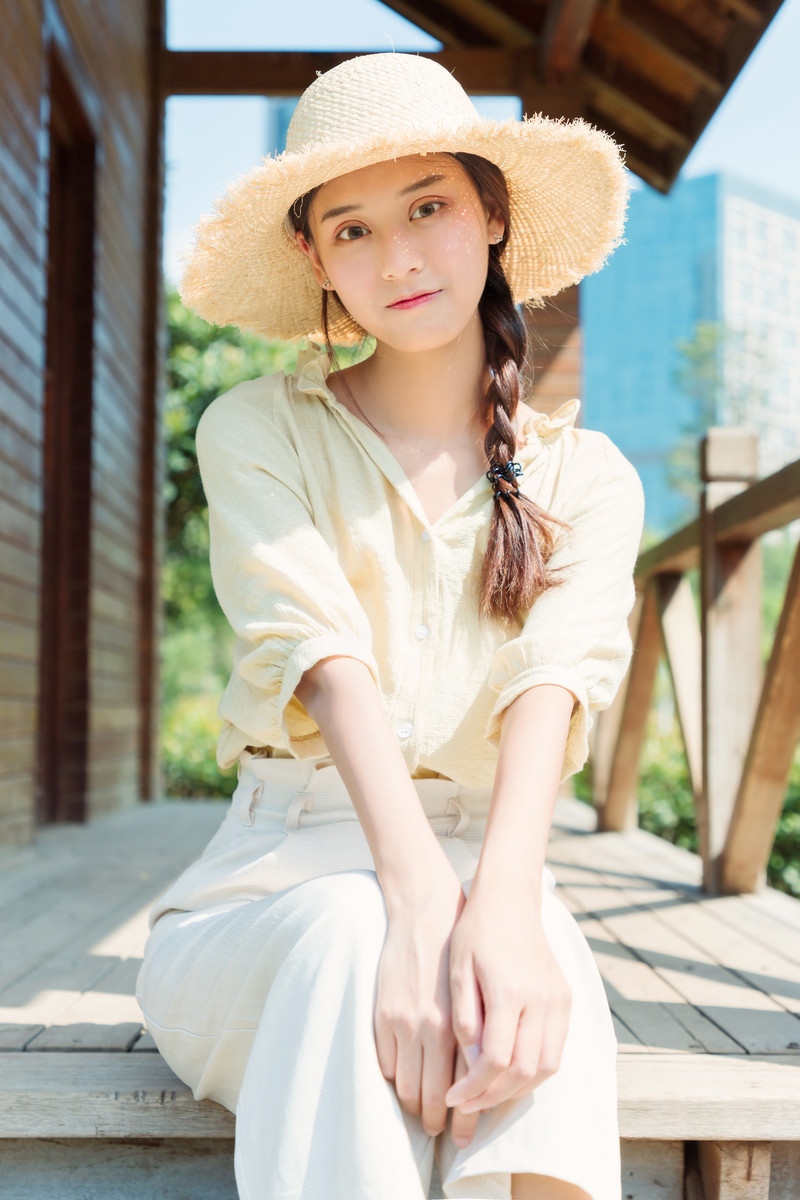 这组照片中的女子可性感,可温婉,可萝莉,可御姐,静若处子动若脱兔,她带着一顶太阳帽,笑起来很阳光,让人觉得很温暖。