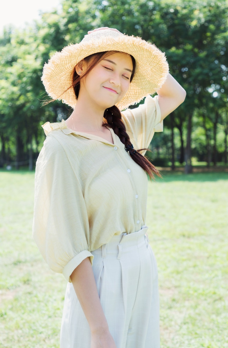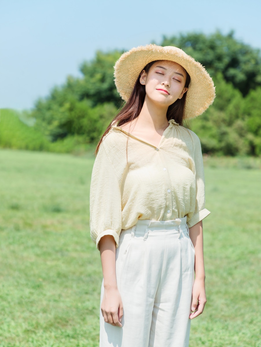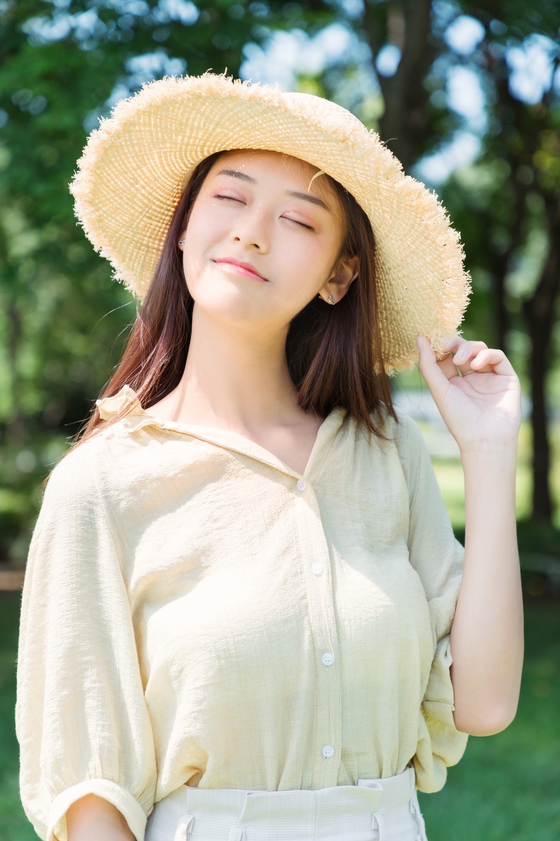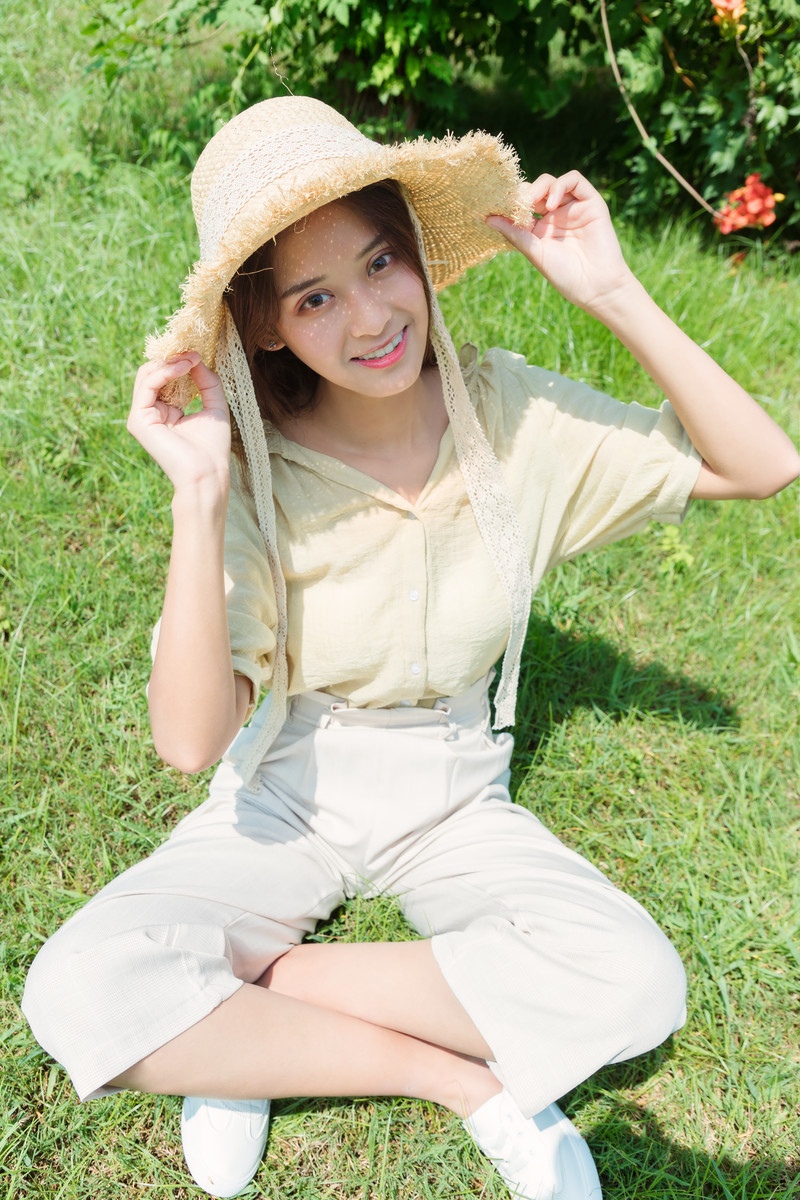 这组照片中的女子可性感,可温婉,可萝莉,可御姐,静若处子动若脱兔,她带着一顶太阳帽,笑起来很阳光,让人觉得很温暖。