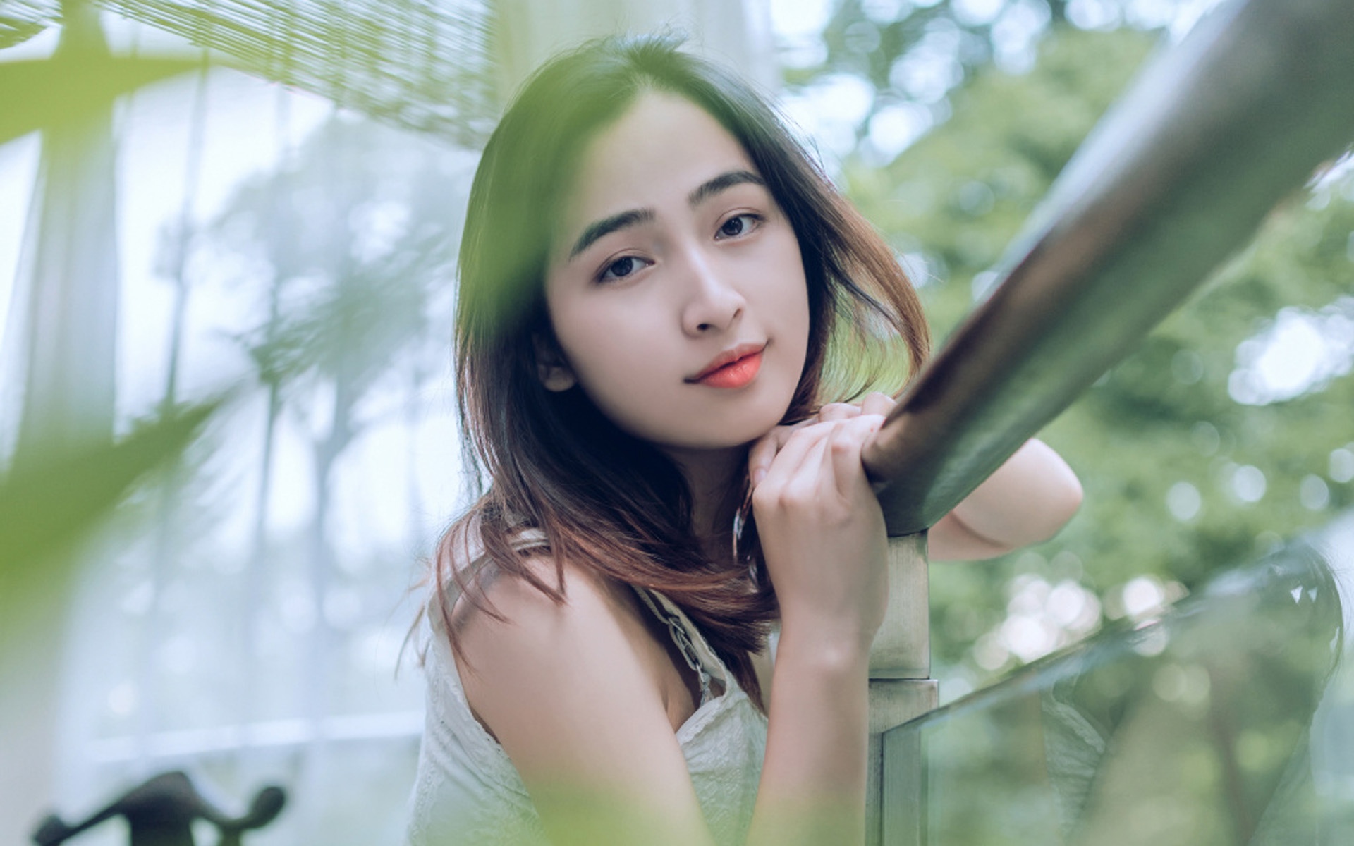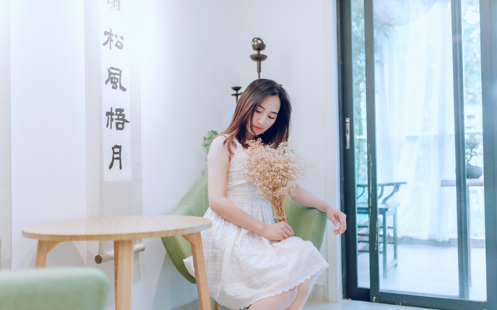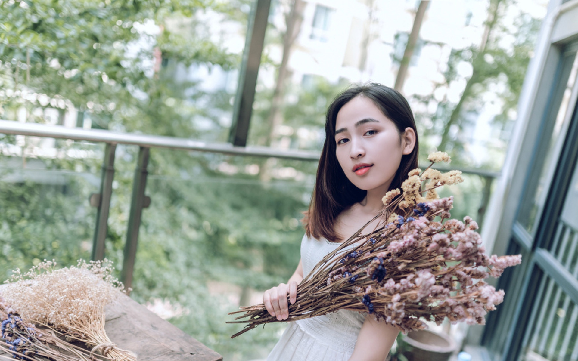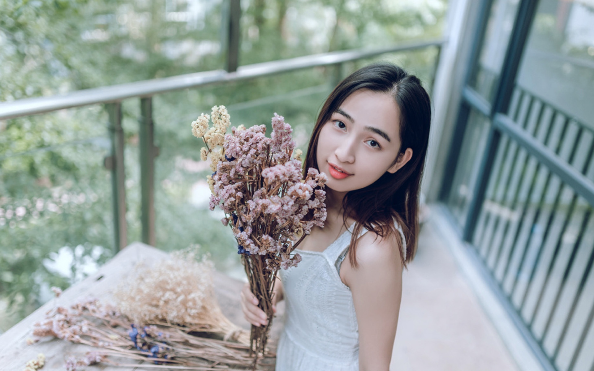 她秀雅绝俗,自有一股轻灵之气,肌肤娇嫩、神态悠闲、美目流盼、桃腮带笑、含辞未吐、气若幽兰,说不尽的温柔可人。穿着白裙,抱着鲜花,像是一个花仙子。