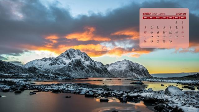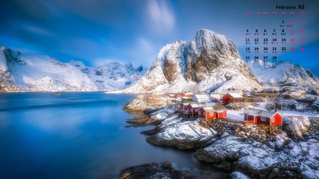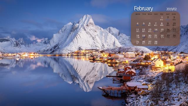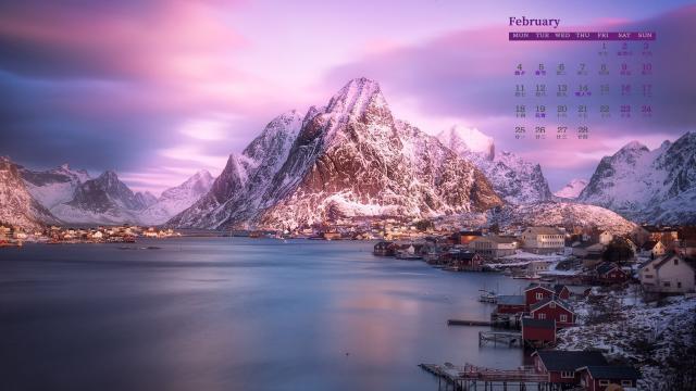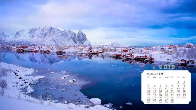 2019年2月挪威小镇冬日唯美雪景日历壁纸,雷讷位于罗弗敦群岛,背靠远古冰川的雕琢侵蚀而成的山峰,一景一物都值得玩味。冬日的雪景更是美得迷人!