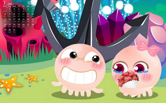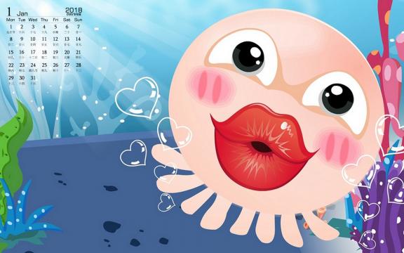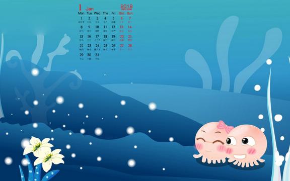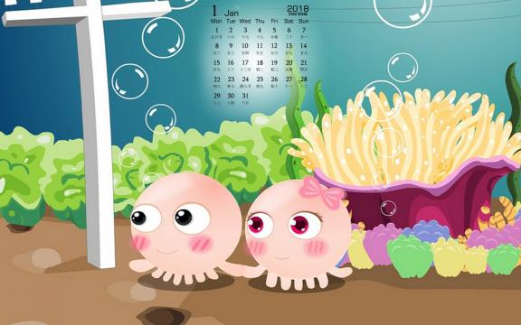 2018年1月小章鱼可爱日历高清桌面壁纸。NOMO是一对生活在海底世界里的章鱼,NONO善解人意,幽默大方,偶尔多愁善感,陷入沮丧而不可自拔,在感情上对MOMO百依百顺,浪漫无比;在生活中总会营造快乐的气氛来呵护MOMO。MOMO温柔可爱,有着善良,关心他人,热心助人等的女性美。不在乎别人的眼光,对NONO始终如一。总在NONO陷入沮丧时给予支持和鼓励,NOMO的爱纯洁感人。世界里两只章鱼上演着一幕幕纯结感人的恋曲…