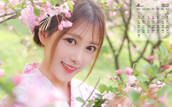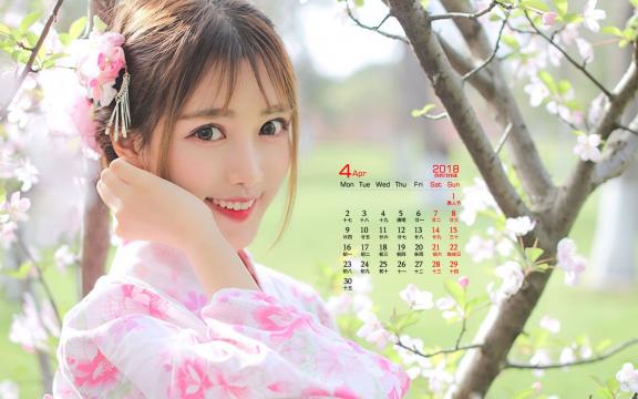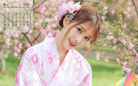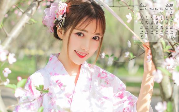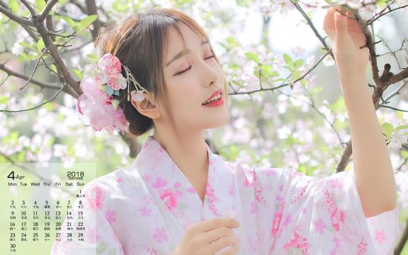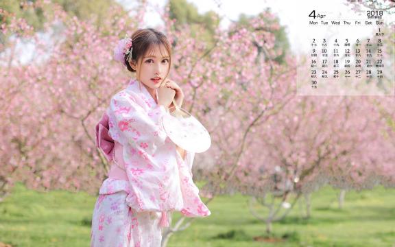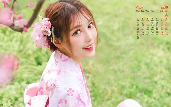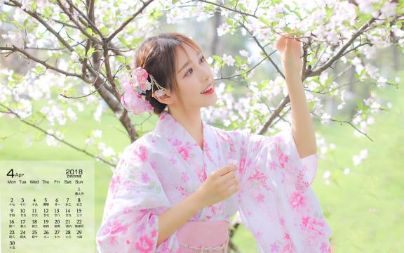 2018年4月和服美女清纯可人写真日历壁纸,图片中的女孩身穿和服,皮肤白皙娇嫩,清新养眼,粉嫩迷人。