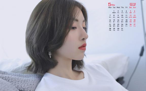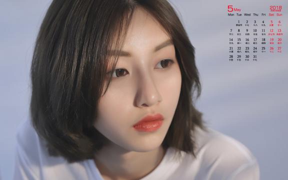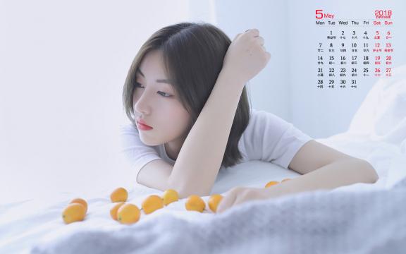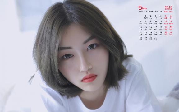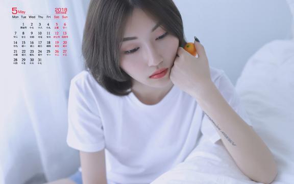 2018年5月白皙清纯美女居家写真日历壁纸,图片中的女孩身穿白色短袖t恤,清爽简约,白嫩诱人。