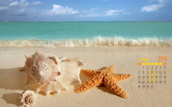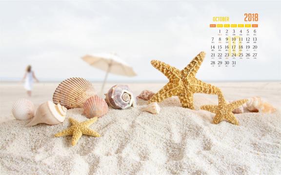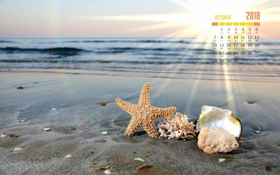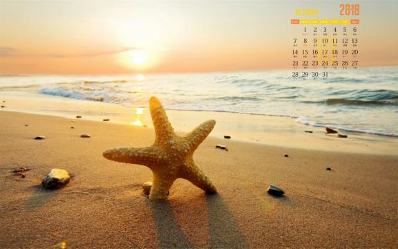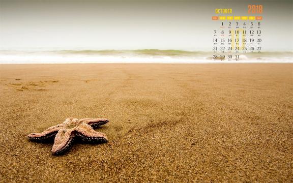 2018年10月沙滩上可爱海星图片日历壁纸,有一次,我在海滩旁边捡到一只海星,它的腕长长的,每个腕上都有一个个小小的吸盘,旁边有一些小刺保护着。大自然造物真神奇,为什么会造出这么漂亮的生物。