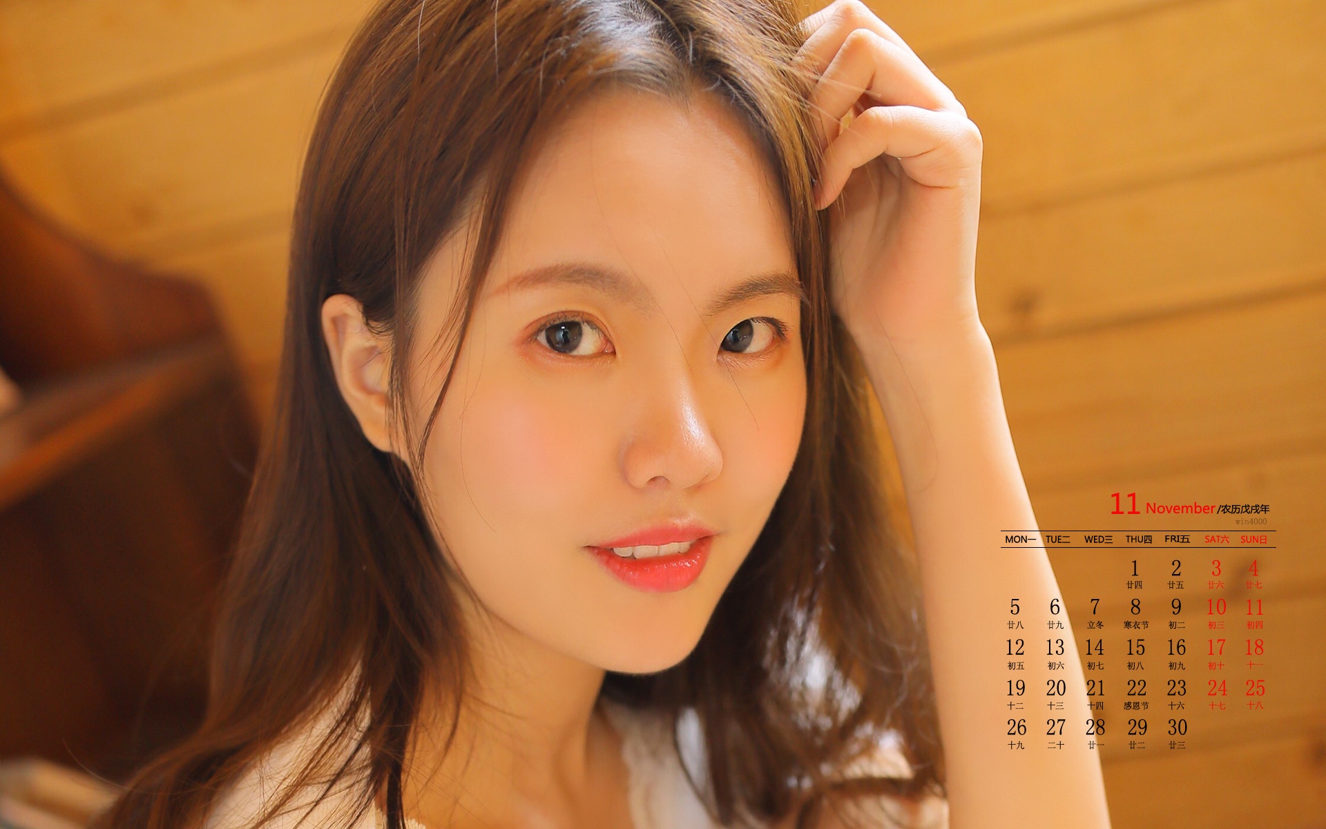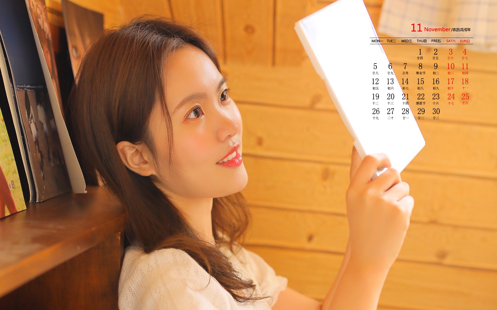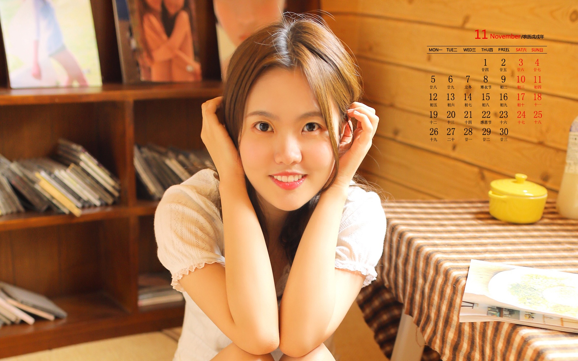 2018年11月清纯美女室内暖色调写真日历壁纸,清爽的头发,清秀的脸庞,清澈的眼眸,还有那由内而外散发出的清新自然的气息,绘成一幅清美的画卷。