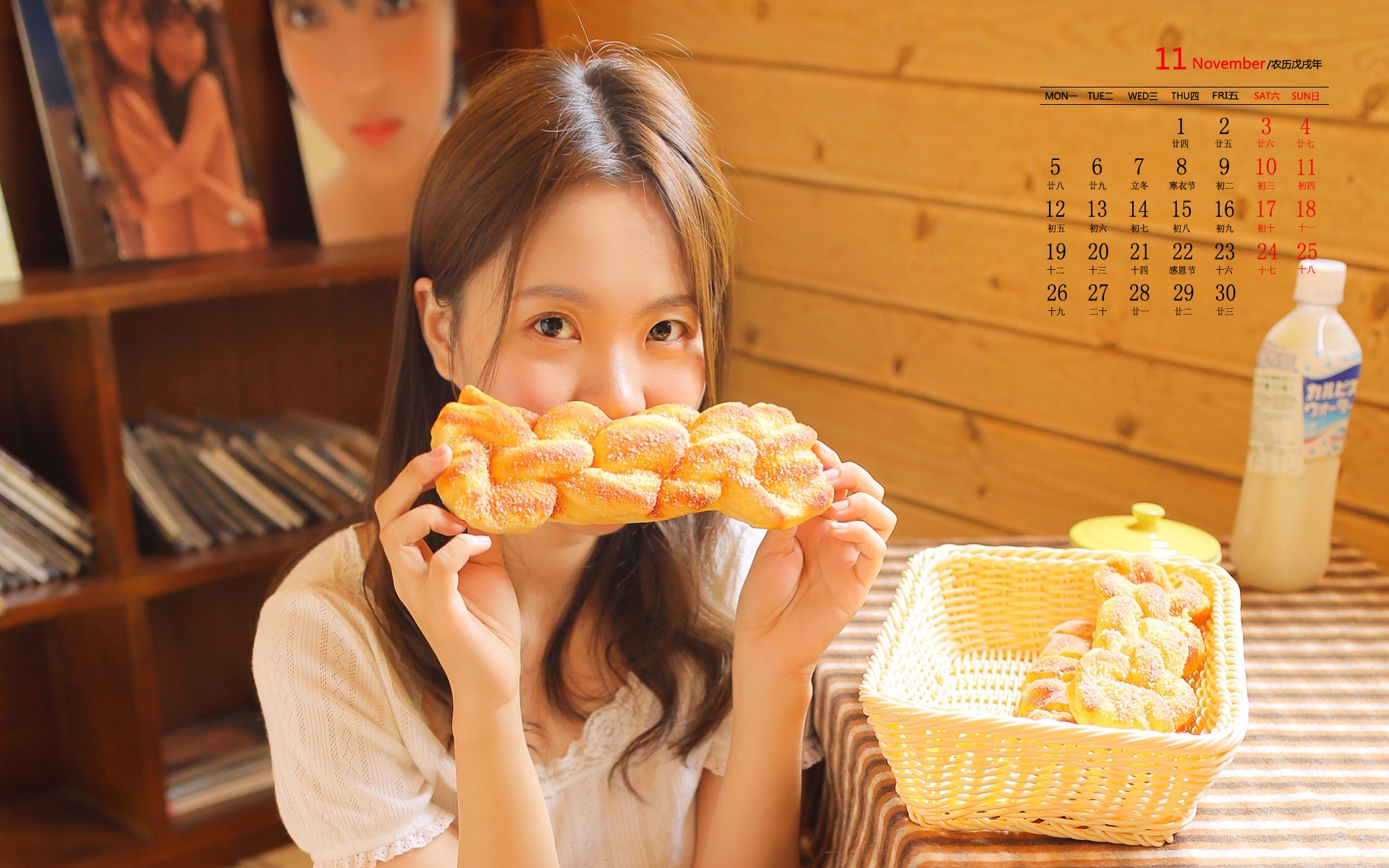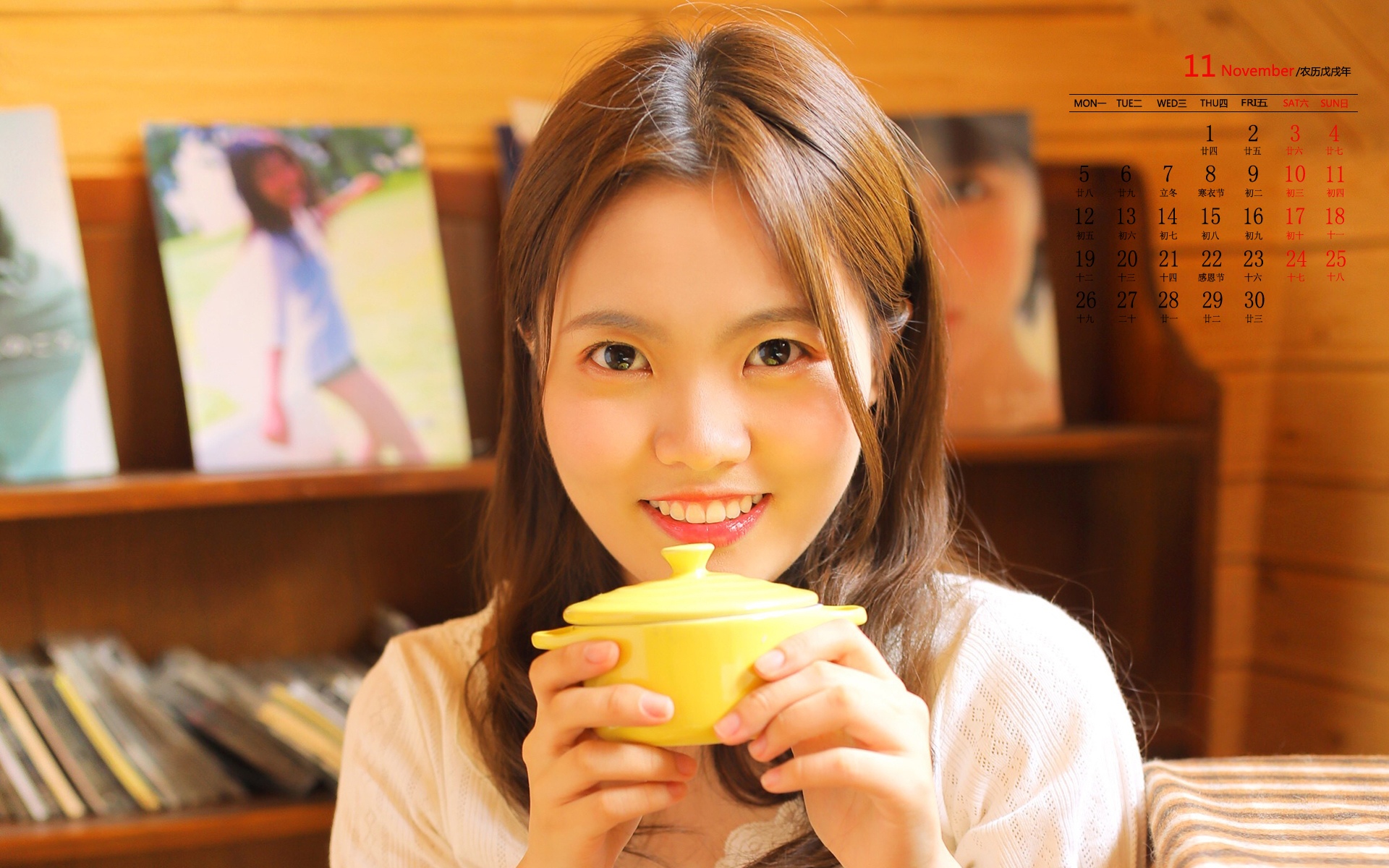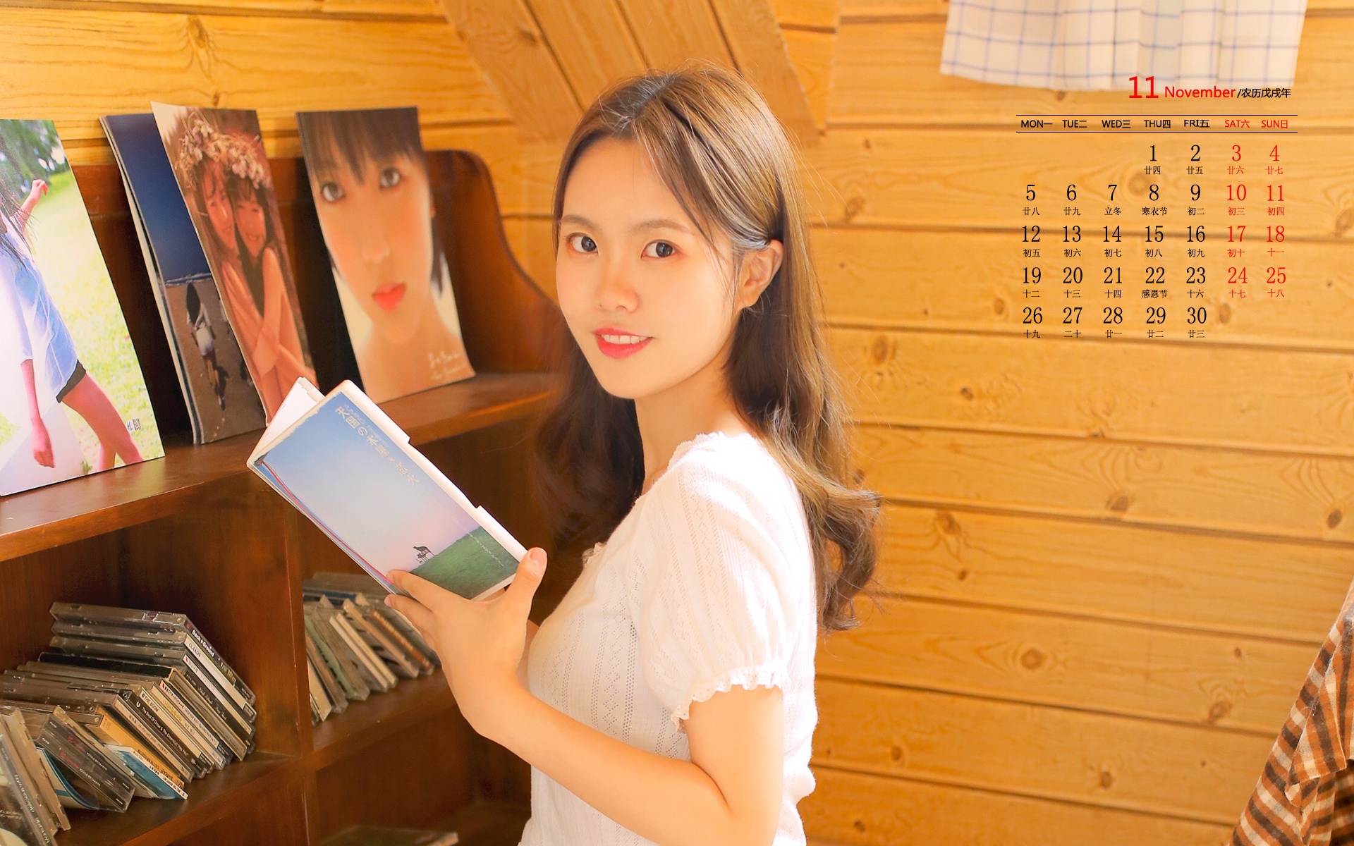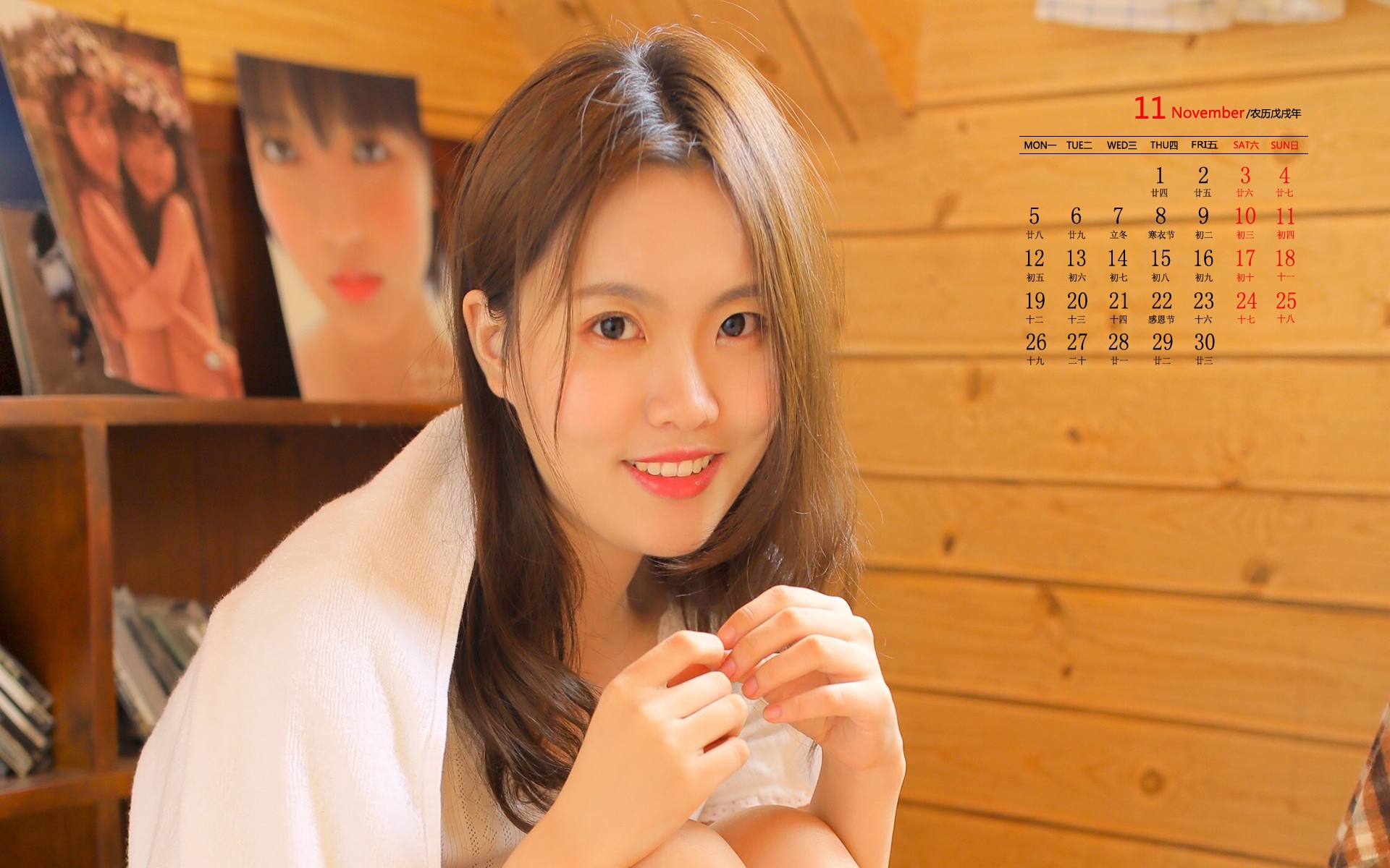 2018年11月清纯美女室内暖色调写真日历壁纸,清爽的头发,清秀的脸庞,清澈的眼眸,还有那由内而外散发出的清新自然的气息,绘成一幅清美的画卷。