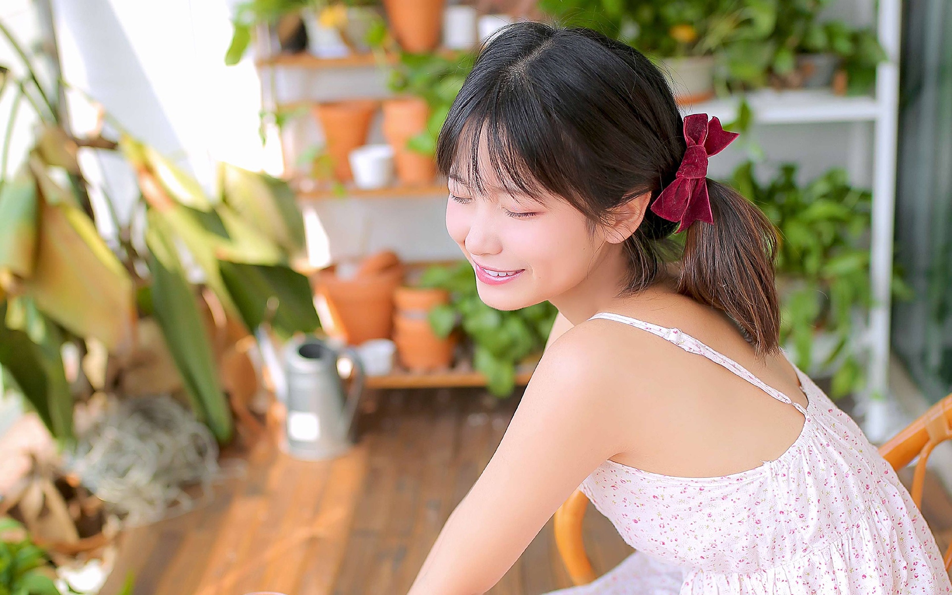 清新可爱居家美女壁纸,清澈明亮的瞳孔,弯弯的柳眉,长长的睫毛微微地颤动着,白皙无瑕的皮肤透出淡淡红粉,薄薄的双唇如玫瑰花瓣娇嫩欲滴。